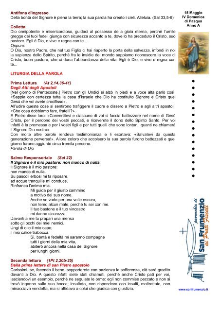 PDF Prima Lettera di Pietro - WebDiocesi Dalla prima lettera di san Pietro apostolo 1 [1]Pietro, apostolo di Gesù Cristo, ai fedeli dispersi nel Ponto, nella Galazia, nella Cappadòcia, nell'Asia e nella Bitinia, eletti [2]secondo la prescienza di Dio Padre, mediante la santificazione dello Spirito, per obbedire a Gesù Cristo e per essere aspersi del suo sangue: grazia e Dalla prima lettera di san Pietro, apostolo 3, 1-17 Home Alla Luce della Parola Dalla prima lettera di san Pietro, apostolo 3, 1-17 Dalla prima lettera di san Pietro, apostolo 3, 1-17 9 Aprile 2015 michele Alla Luce della Parola Commenti disabilitati bibbia2 Imitare la mitezza di Cristo Liturgia delle Ore - Ufficio delle Letture - a te si piegano i tuoi nemici. A te si prostri tutta la terra, * a te canti inni, canti al tuo nome». Venite e vedete le opere di Dio, * mirabile nel suo agire sugli uomini. Egli cambiò il mare in terra ferma, † passarono a piedi il fiume; * per questo in lui esultiamo di gioia. Con la sua forza domina in eterno, †