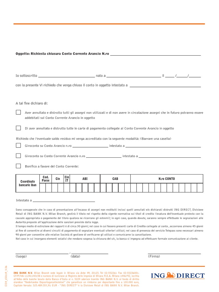 Fac-simile lettera per chiusura conto corrente bancario - Impresa Futura lettera chiusura conto corrente unicredit modulo chiusura conto corrente pdf lettera chiusura conto corrente bnl lettera chiusura conto corrente mps modulo chiusura conto corrente intesa san paolo chiusura conto corrente cointestato. Oggetto: richiesta di estinzione conto corrente. Il sottoscritto _____- residente in _____ via _____- CF ...
